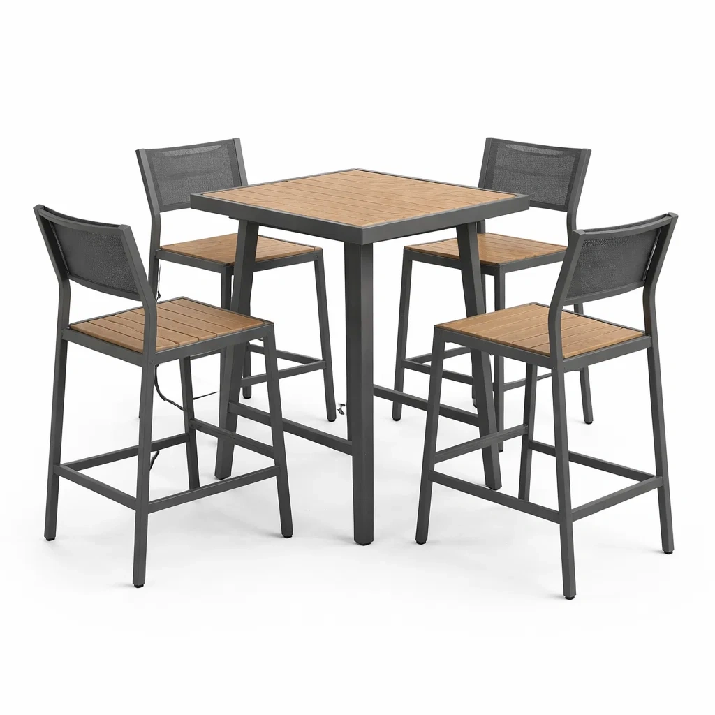 Ensemble de bar extérieur aluminium et bois composite avec 1 table et 4 chaises